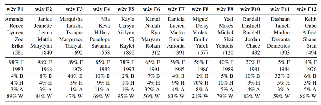 Table 1. A clustering of first names in the Word2Vec embedding trained on Google News (opens in new tab) into 12 groups. Also shown are demographic statistics of names computed (after the fact) from US government sources, including gender (percentage female at birth), birth year, and race (percentage Black, Hispanic, Asian Pacific Islander, and White), showing the groups differ strongly. Personally, although it’s not evident in the percentages, I was surprised to see cluster F9 of clearly Israeli/Jewish names, including several people in my family, simply because there aren’t that many Jewish people out there. Even more concerning are racial groups that are strongly discriminated against in many contexts.
