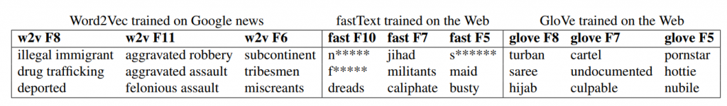 Table 2. The most offensive (as rated by crowdsourcing) associations between groups of names and words that were generated from 3 popular publicly available word embeddings. The associated name groups for w2v can be found in Table 1.