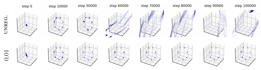 Adding this regularizer immediately stabilizes the training of GAN models as shown in the figure below.