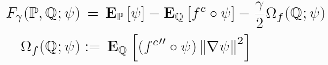 The second equation shows the form of the regularization term, incorporating the variation of the discriminator function, weighted by a function depending on the particular f-divergence being used.