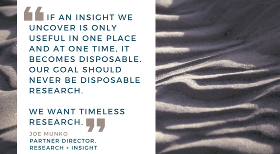 And, you know what? That’s okay! While the need for speed is valuable in some contexts, we also realize that if an insight we uncover is only useful in one place and at one time, it becomes disposable. Our goal should never be disposable research. We want timeless research.