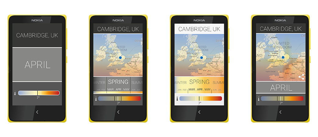 Using the app you could browse a map of the world that was overlayed with data about temperature, precipitation, sunlight and humidity. This was colour coded, showing the average condition for the current month, plus an upper and lower band. Users could browse quickly through the months of an average year, seeing the conditions change on the map.