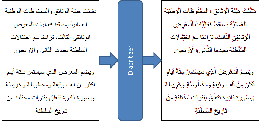 The Arabic diacritizer provides accurate diacritization for Arabic text. Although the Arabic alphabet does have consonants and vowels, people usually write Arabic text without vowels.