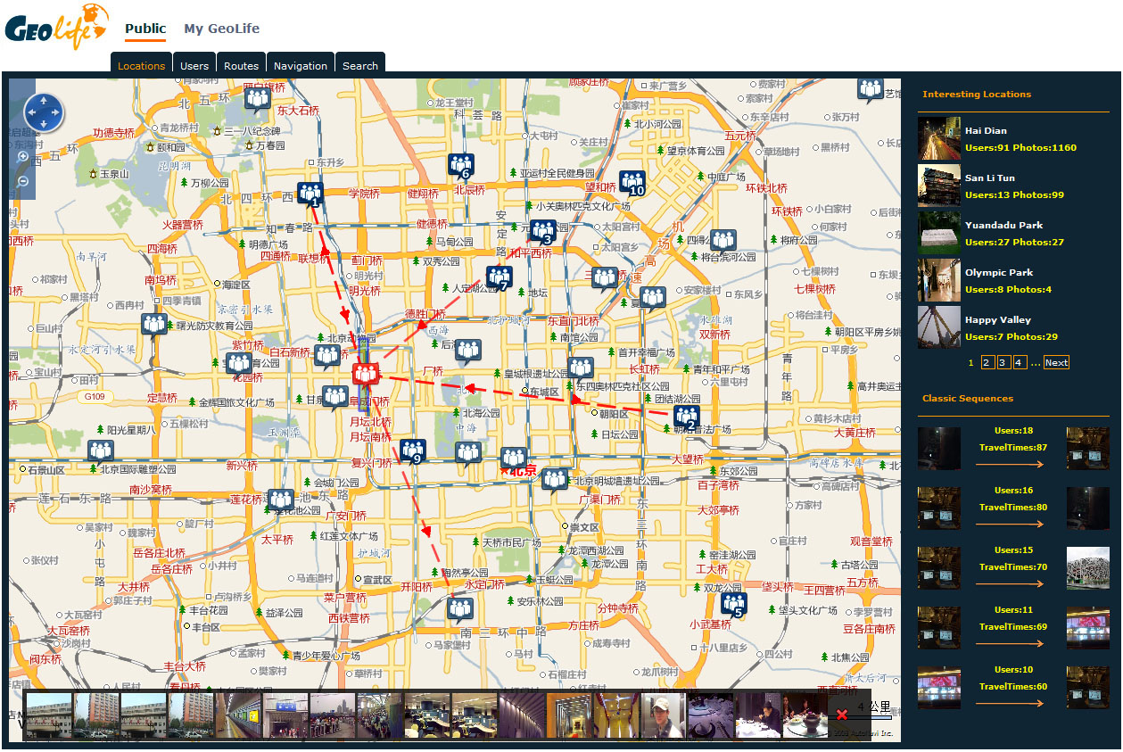 Log onto MyGeoLife using your Live messenger account, GeoLife can recommend you a group of users in terms of the similarity between your location histories and theirs. As people’s location histories imply to some extent their tastes and preferences, these users, called potential friends, might share similar interests with you. Without GeoLife you would never know these potential friends even you guys have passed by with each other in a street many times. With this friend list, you can conveniently deliver invitations to these persons in the community and hence sponsor, with minimal effort, a social activity such as hiking, cycling, or traveling. As they share similar interest with you, they are more likely to accept your invitation. Further, from these potential friends’ past experiences, you are more likely to discover some places that might match your tastes while have not been found by yourself. It is a personalized location recommendation.