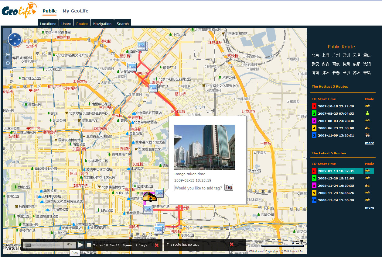 By uploading your GPS data and associated multimedia content like photos to the website of GeoLife, you can interact with your trajectory like playing a video. First, you can enjoy and memorize your past experiences on a map. Second, you can share it with your friends. Thus, your friends can know where you have been, see what you saw and understand the whole journey within a few seconds. It is more intuitive and convenient than writing and reading a blog.