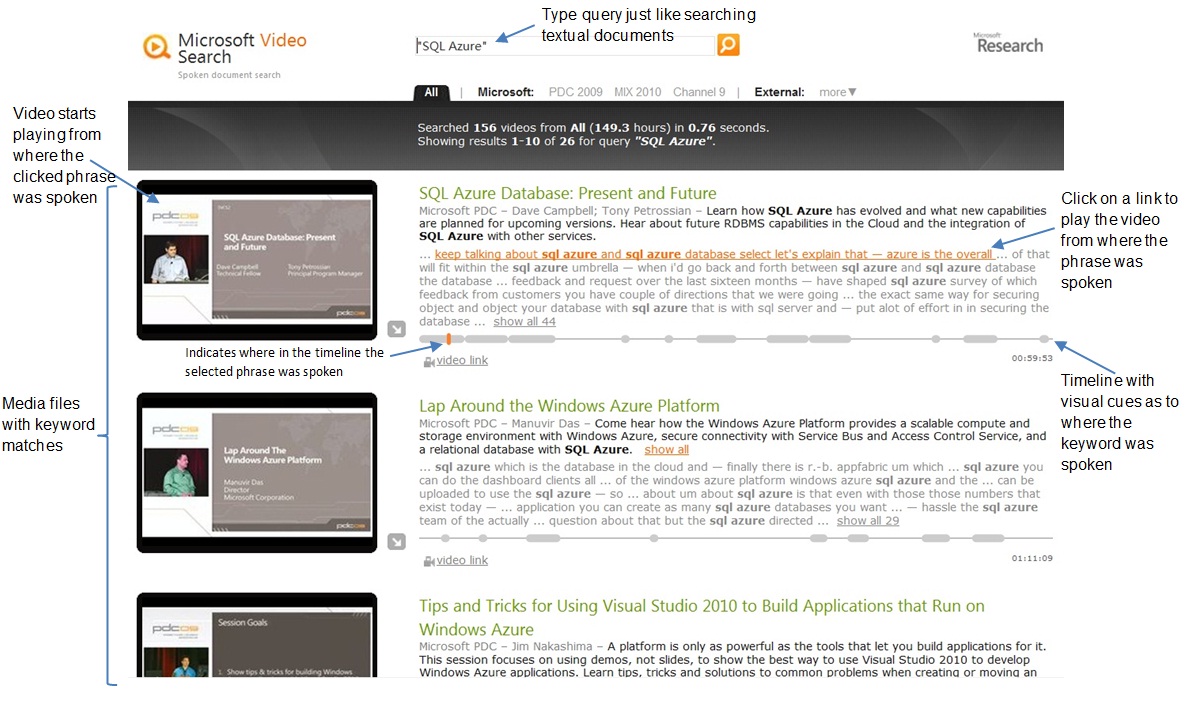 Highly accurate audio search Results – MAVIS uses state of the art Deep Neural Net (DNN) based speech recognition (opens in new tab) technology developed at Microsoft Research to convert digital audio signals into words. Furthermore, MAVIS reduces errors in speech recognition by automatically expanding its vocabulary, and storing word alternatives using a technique referred to as Probabilistic Word-Lattice Indexing, explained in the technical background. These techniques help provide highly accurate search results.