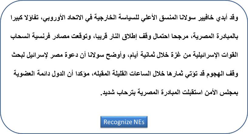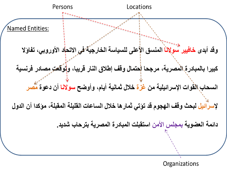 The Arabic Named Entity Recognizer (NER) extracts named entities from standard Arabic text and classifies them into three main types: proper names, locations, and organizations. Arabic NER can extract foreign and Arabic names, location entities such as cities, countries, streets, squares, as well as organizations like sports teams, political parties, companies, and ministries.