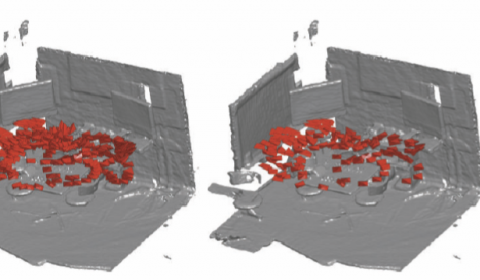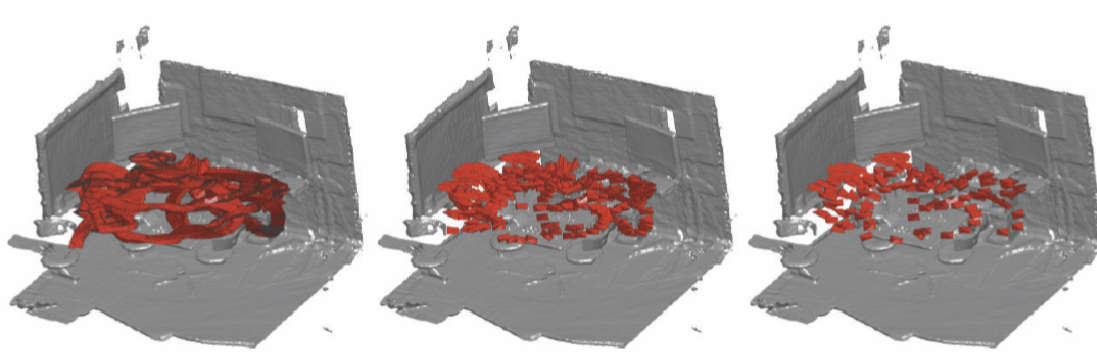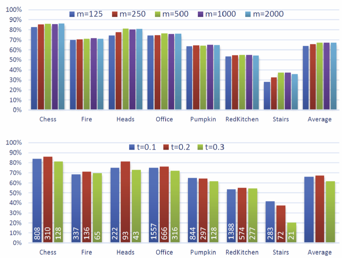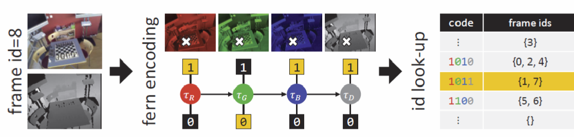 We introduce an efficient camera relocalization approach which can be easily integrated into real-time 3D reconstruction methods, such as KinectFusion. Our approach makes use of compact encoding of whole image frames which enables both online harvesting of keyframes in tracking mode, and fast retrieval of pose proposals when tracking is lost. The encoding scheme is based on randomized ferns and simple binary feature tests. Each fern generates a small block code, and the concatenation of codes yields a compact representation of each camera frame. Based on those representations we introduce an efficient frame dissimilarity measure which is defined via the block-wise hamming distance (BlockHD). We illustrate how BlockHDs between a query frame and a large set of keyframes can be simultaneously evaluated by traversing the nodes of the ferns and counting image co-occurrences in corresponding code tables. In tracking mode, this mechanism allows us to consider every frame/pose pair as a potential keyframe. A new keyframe is added only if it is sufficiently dissimilar from all previously stored keyframes. For tracking recovery, camera poses are retrieved that correspond to the keyframes with smallest BlockHDs. The pose proposals are then used to reinitialize the tracking algorithm. Harvesting of keyframes and pose retrieval are computationally efficient with only small impact on the run-time performance of the 3D reconstruction. Integrating our relocalization method into KinectFusion allows seamless continuation of mapping even when tracking is frequently lost. Additionally, we demonstrate how marker-free augmented reality, in particular, can benefit from this integration by enabling a smoother and continuous AR experience.