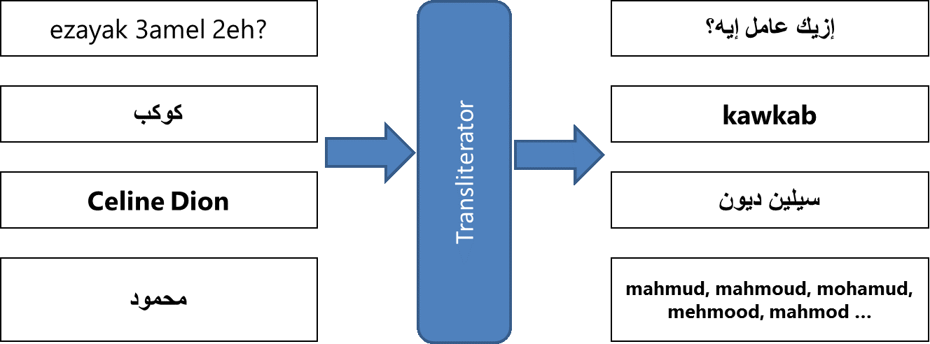 The Transliterator converts text from Romanized Arabic (Arabic written in English characters) to native Arabic script and vice versa. A common example of that is the transliteration of named entities