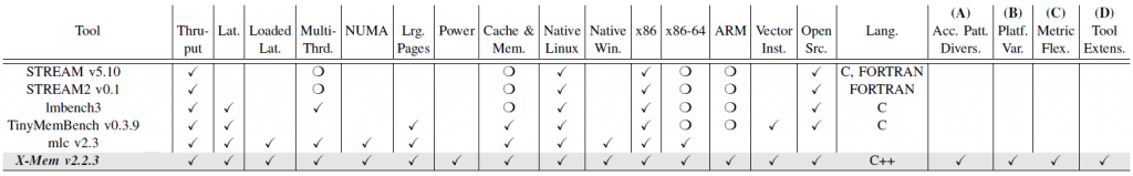 We have published our findings on X-mem at ISPASS 16 and released source code under the MIT license on the Microsoft GitHub (opens in new tab) store. We have ported X-mem to several platforms including Intel Atom micro-servers and ARM-based evaluation boards. The table below provides a comparison of X-mem and other relevant tools for DRAM characterization.