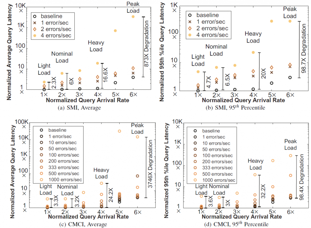 Error-management settings: We have utilized X-mem to study hard and correctable faults that occur in DRAM. Using an internal, tail latency sensitive, web-search workload, we have found that SMI interrupt settings (133 ms) degrade both the average and 95th percentile performance much faster than CMCI settings (775 us) because of their higher handling latency (see figure). Our experiments with X-mem have thus helped make internal decisions on picking the correct error handling settings for specific workloads.