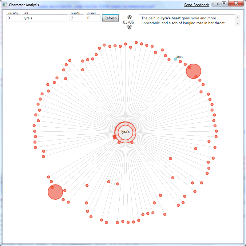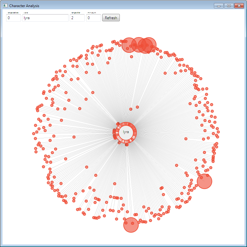 The first of the visualization ideas that we implemented were the character flowers. Figure 1 shows the character flower for the word Lyra. Central to the flower is the word “lyra” itself, surrounded by a ‘lifebelt’ which shows, starting from the 12 O’clock position, the occurrences of the word “lyra” through the series, with each occurrence resulting in a thin red line.