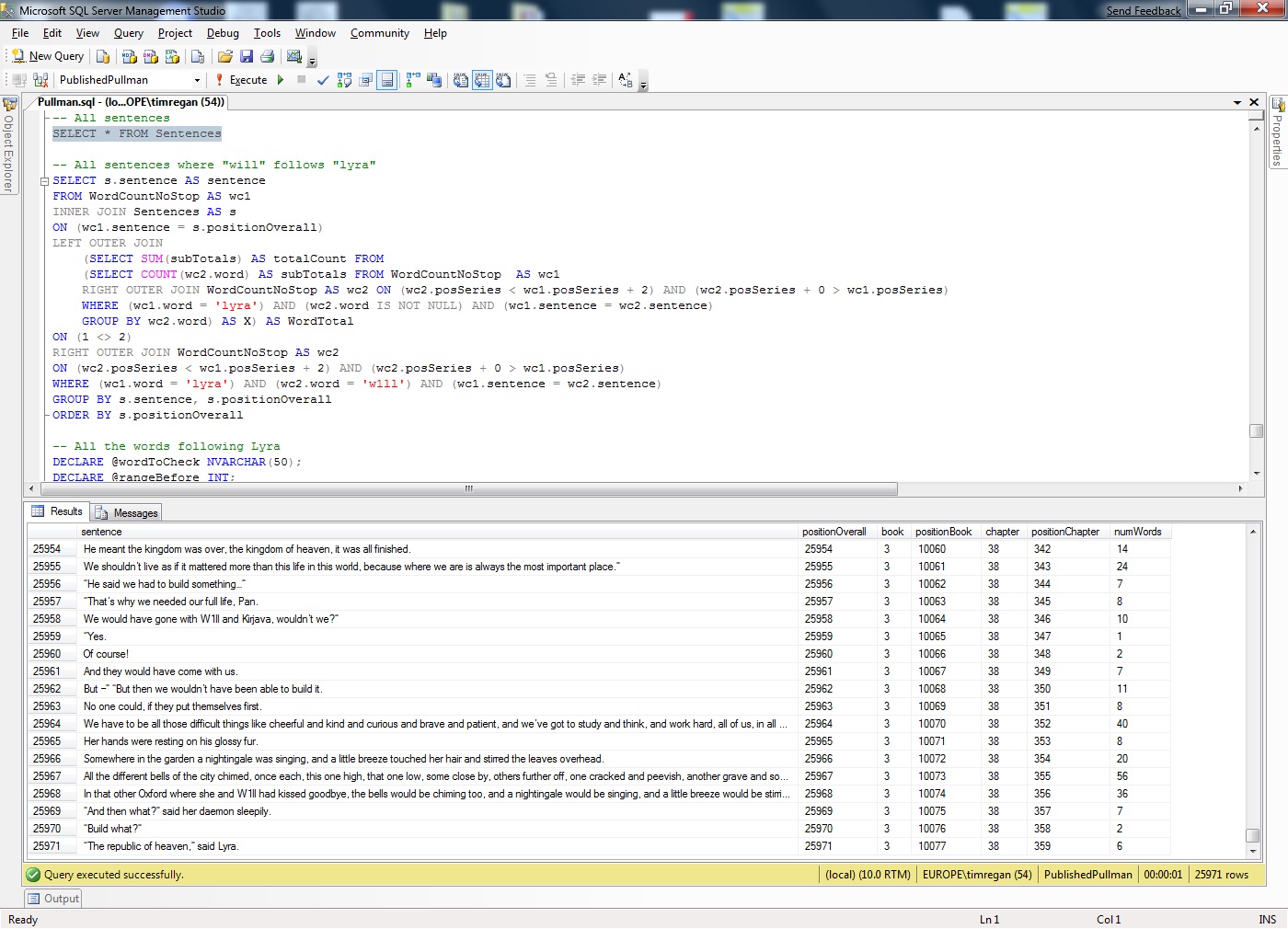 We can see from the number of crowded red lines that “lyra” is a frequently occurring word, as we would expect, but that the second and third books contain episodes where she is not mentioned. Moving out from that each ‘bud’ represents a word. Here we are looking at all the words which immediately follow the word “lyra” in a sentence. Those words are arranged in order of the frequency with which they appear after “lyra”, and the size of the bud reflects the frequency of the word overall (i.e. the number of chapters it occurs in, regardless of whether it occurs after the word “lyra”). The final measure is the distance from the centre that the bud is drawn. This reflects the probability that when the word occurs it occurs after “lyra”. So we see two buds placed near the centre at the start are two words that occur frequently after the word “lyra” and are unlikely to occur elsewhere. Indeed the two words are Lyra’s surnames: Silvertounge and Belacqua. Other words drawn towards the centre are evocative of Lyra’s personality: “joyfully”, “quelled”, “exulted”, “definitely”, “judged”, “raided”, … but two stand out as anomalous: “blushed” and “obediently”. Clicking on the bud brings up the sentences in which the word follows the word “lyra”. From these sentences we find that the terms are used when Lyra is in disguise. In some respects this shows that the visualization works – the anomalies are indeed anomalies, but they are ones consciously placed by Pullman, rather than subconscious ones.