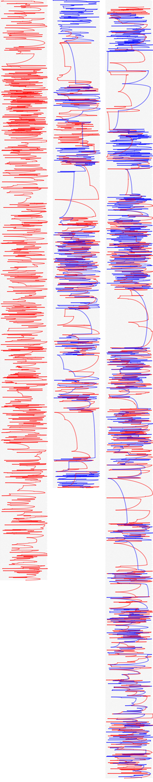 These visualizations show the entire text of the three volumes that make up the trilogy. We were interested to see the rhythm of the characters occurrences in the whole text, especially two related characters. Figure 3 shows a fragment of the entire trilogy, with linked coloured disks over occurrences of Lyra and Will’s names. We can quickly see simple facts like Will’s absence from the first book, and more curious aspects like the periods of the second book where neither of them are mentioned (presumably the sections focussed on Mary Malone, Lord Asreil, or Mrs Coulter). Printed out this diagram is many feet long, and the text itself is (just) readable. This combination of text level detail and global pattern is particularly interesting. I was hoping that this visualization would highlight a poetic choice across the trilogy. Tolstoy starts and ends “Anna Karenina” at a railway station, and Pullman purposefully opens the first book with the word “Lyra” and ends the last book with the word “Lyra”. This should stand out as the visualization should start and end with a coloured disk. But it does not. In fact Pullman precedes the start of his book with a quote from Milton’s “Paradise Lost”, which stops the poetic symmetry coming out in the visualization.