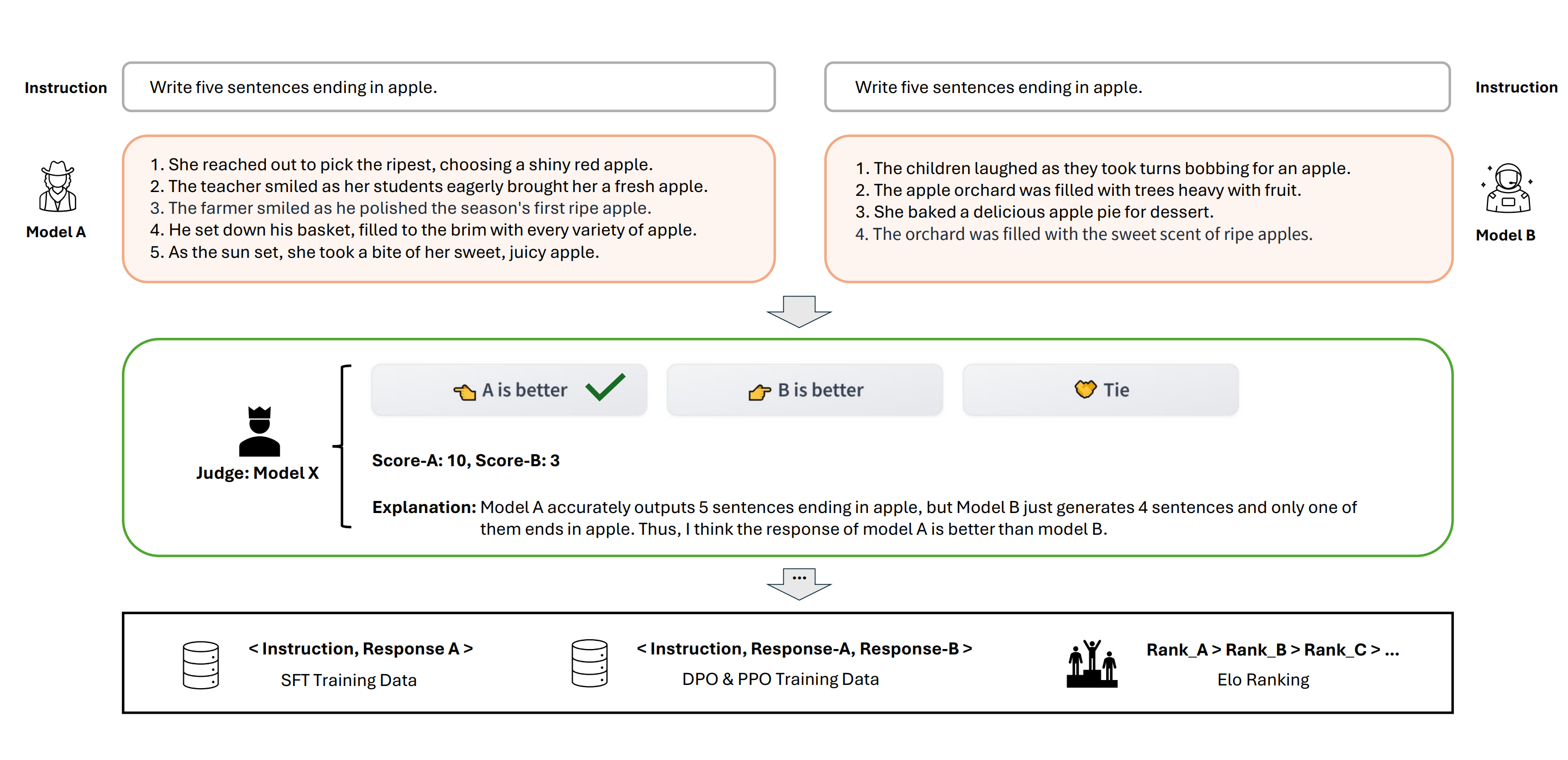 To address these challenges, this paper introduces a novel approach called Arena Learning, which is a training and evaluation pipeline fully based on and powered by AI LLMs without human evaluators. The primary objective of Arena Learning is to build an efficient data flywheel and mitigate the manual and temporal costs associated with post-training LLMs while retaining the benefits of arena-based evaluation and training. As the running example shown in the Figure 1, the key is that Arena Learning simulates a offline chatbot arena, and can efficiently predict accurate performance rankings among different arena battle models based on a powerful “judge model”, which could automatically imitate the manner of human annotators in judging a responses pair of two models and provide rankings, scores, and explanation.