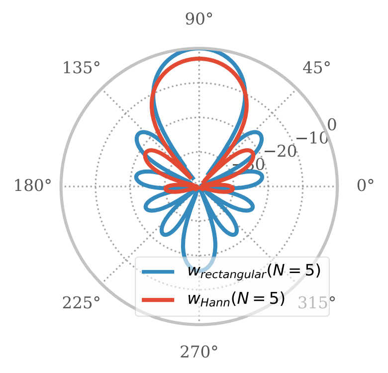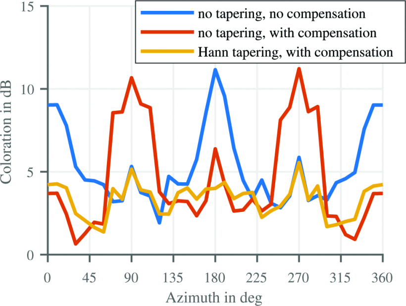 Figure: a) coloration estimation of third order HRIR reconstruction above 2.5 kHz for impulse responses moving around the listener in ten degree steps in the horizontal plane (θ = 90°); b) cross section (θ = 90 deg) of a spatial dirac pulse magnitude in dB, reconstruction with N = 5 at Ω = [90 deg, 90 deg], and with additional Hann tapering function of SH coefficients as in (8).