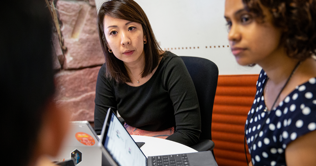 Image of several employees gathered around a desk.