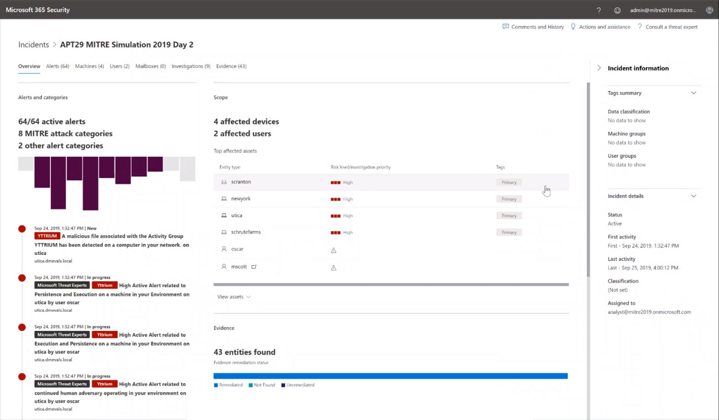 Although this test was focused on endpoint detection and response, MITRE ran the simulated APT29 attack from end to end and across multiple attack domains, meaning defenders benefited from visibility beyond just endpoint protection. This gave Microsoft the unique opportunity to bring Microsoft Threat Protection (MTP) to the test.