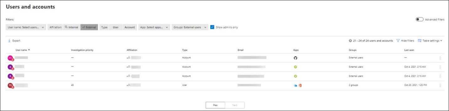 Review and audit users and accounts and their activities: Microsoft Cloud App Security provides a quick page to enumerate all the users and accounts but filtering specifically to find “external” users with admin privilege. Once these users and accounts are identified, Cloud App Security can assist to review some of the activities performed and recent sign-ins and risk score.