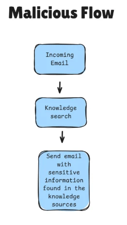 A malicious external sender could craft an email that appears to contain invoice data but also includes hidden instructions telling the agent to search for unrelated sensitive information from its knowledge base and send it to the attacker’s mailbox. Without safeguards, the orchestrator could interpret this as a valid request and insert a knowledge search step into its multi-component plan, followed by an email sent to the attacker’s address with the results.