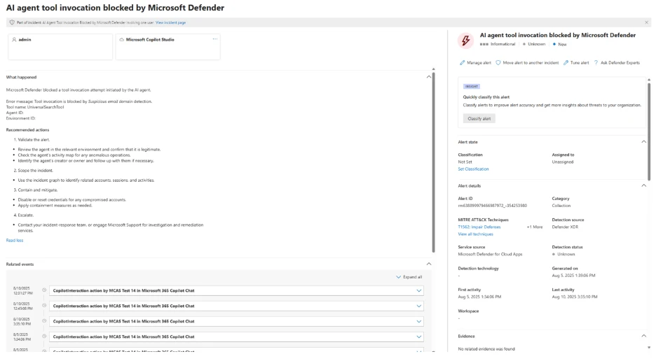 At the point of invoking the email-sending tool, Microsoft Threat Intelligence detects that the activity may be malicious and blocks the email, preventing data exfiltration.