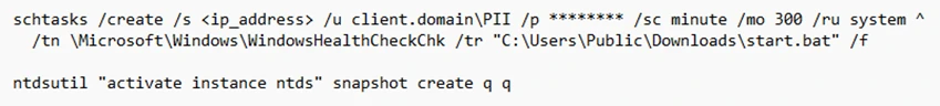 Within 24 hours, the attacker abused privileged accounts and remotely created a scheduled task on a domain controller. The task initiated NTDS snapshot activity and packaged the output using makecab.exe, enabling offline access to directory credential material that’s suitable for abusing credentials at scale: