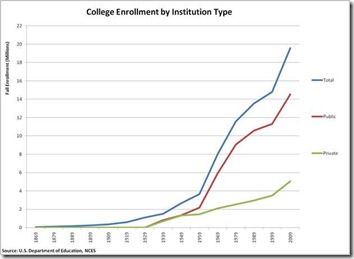 First, the good news, college enrollments are up by a large factor in the United States, seeing an exponential growth since 2000. Much of this could be attributed to the job market being tighter and people having to go to college to break open that first door.
