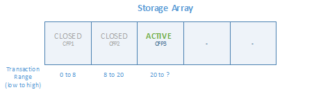 The metadata of all Checkpoint File Pairs (i.e. CFP) that exist in storage is stored in an internal array structure referred to as Storage Array. It is a finitely sized (4096 entries in CTP2 and 8192 entries in RTM) array of CFPs to support a cumulative size of 256GB for durable memory-optimized tables in the database. The entries in the storage array ordered by transaction range. The CFPs in the storage array (along with the tail of the log) represent all the on-disk state required to recover a database with memory-optimized tables.