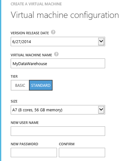 To provision an optimized transactional or DW VM image by using the Azure Management Portal,