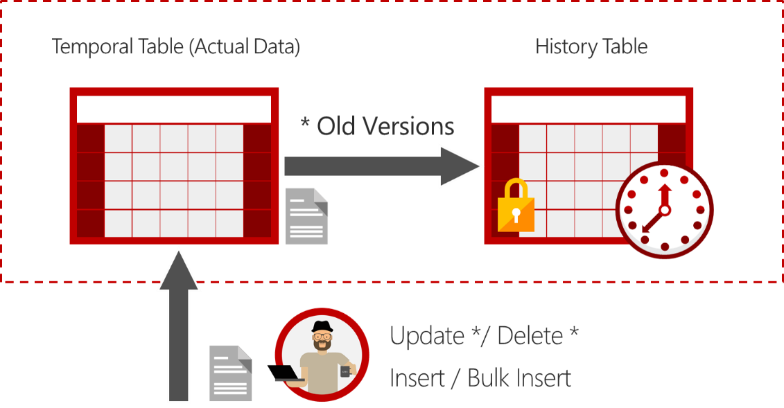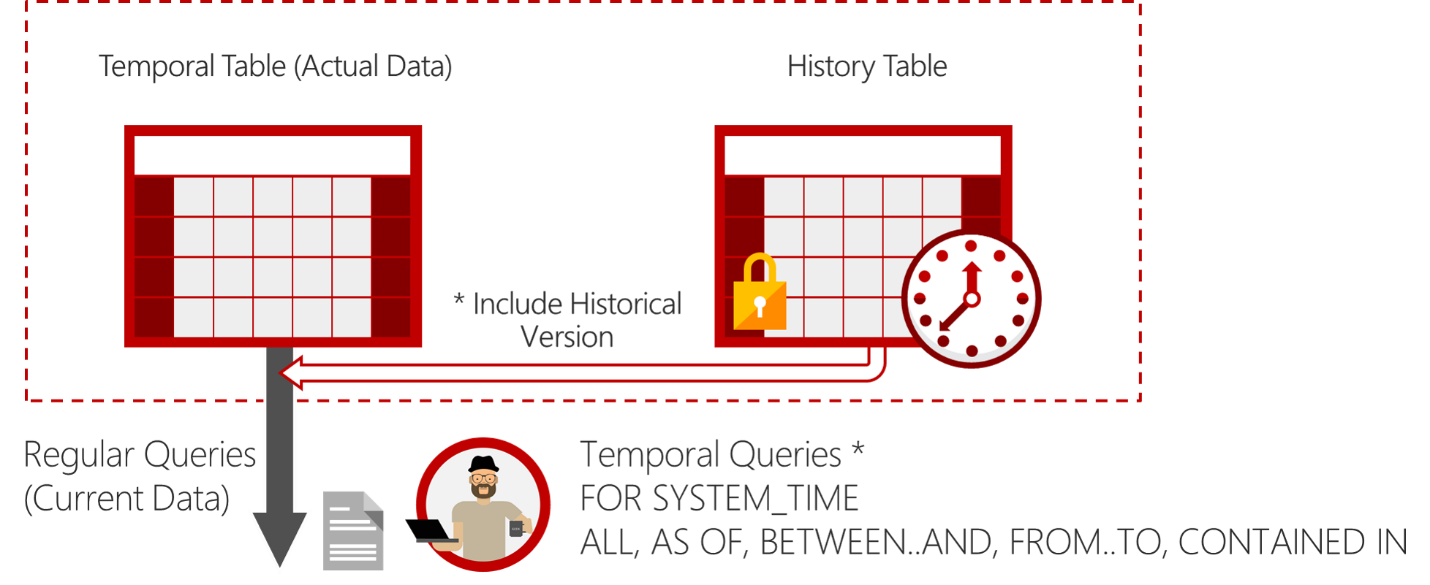 - Data protection: Temporal Tables ensure immutability of historical data, even for users with edit permissions, which makes Temporal Tables a very good candidate for data audit scenarios. Even system administrators must make a conscious choice to remove system-versioning before making any change to historical data. However, all changes to Temporal Table configuration, including state-of-system versioning, can be easily tracked using SQL Server Audit. For more details, check out Temporal Table Security on MSDN.