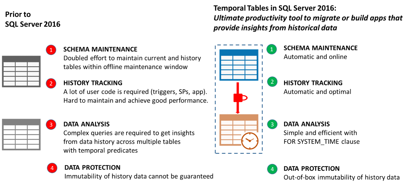 Temporal Tables are a huge productivity booster for SQL Server developers because they simplify every phase in the data lifecycle, from the object creation through schema evolution, data modification, data analysis to security. The image below summarizes all benefits for users.