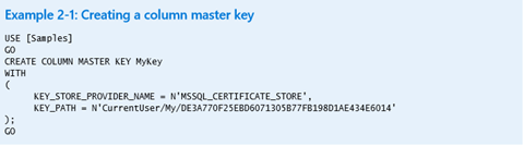 A bit like the outer defenses of a castle, the column master key protects the various column encryption keys that actually encrypt the data within a table. You can create a master key with SSMS, though T-SQL offers a more repeatable process, which starts with a CREATE COLUMN MASTER KEY statement, such as the example shown below.