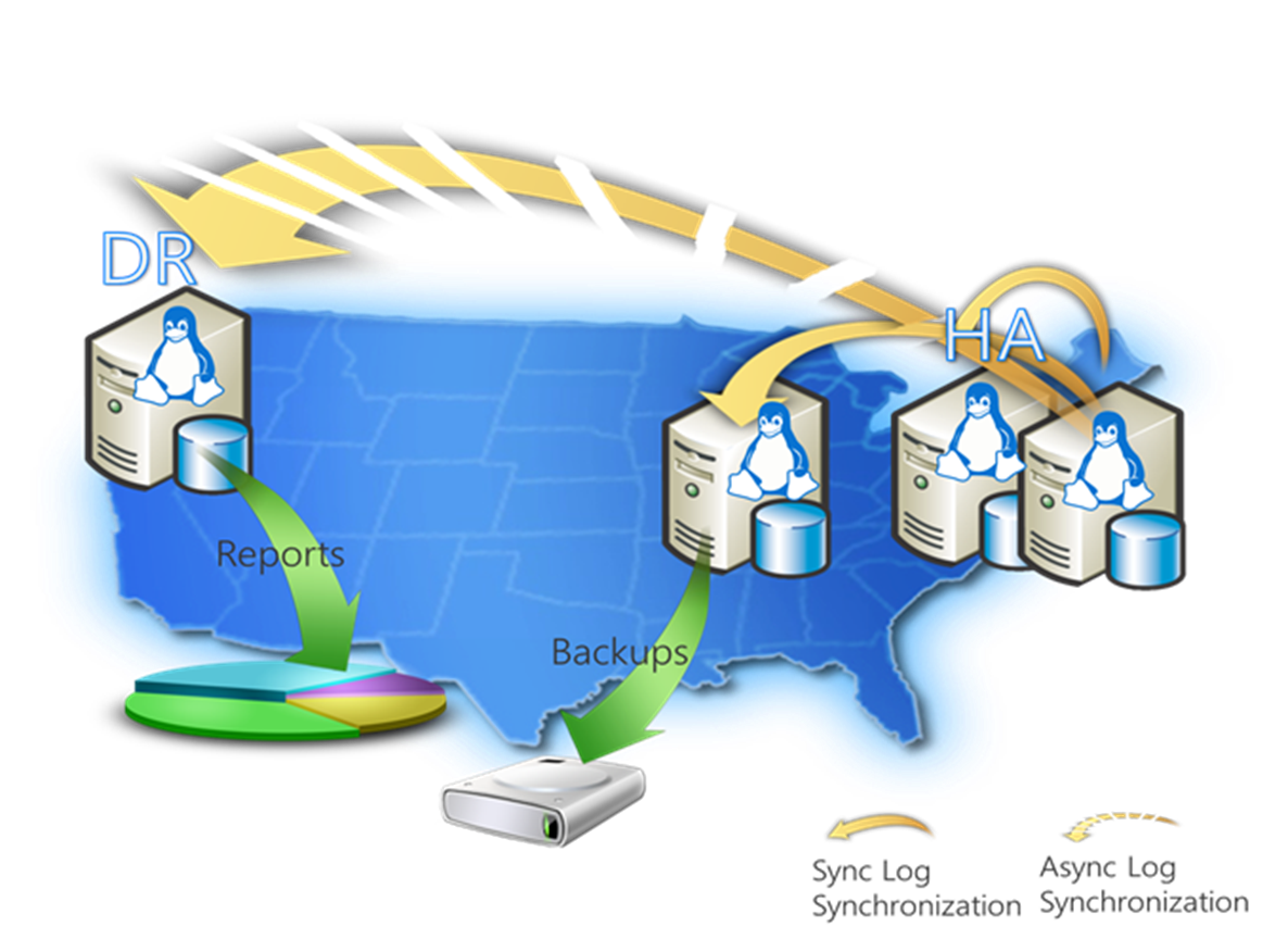 Here is an illustration of a HADR configuration that an enterprise building a mission-critical application using SQL Server running on Linux can use to achieve: application-level protection (two synchronized secondary replicas), compliance with business continuity regulations (DR replica on remote site) as well as enhance performance (offload reporting and backup workloads to active secondary replicas):