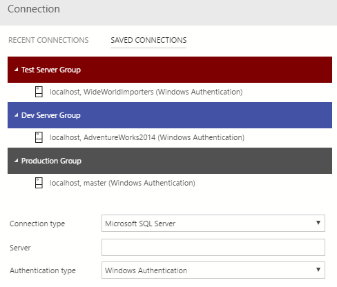 The Connection Dialog now contains a “Saved Connections” tab next to “Recent Connections”. This contains a list of saved server connections from the server’s “Object Explorer” viewlet, as well as the Server Group.