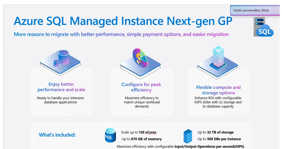 What makes SQL unique is that it’s built on the same engine, no matter where you deploy, which means you can build on your existing SQL experience while gaining the layered security, intelligent threat detection, and data encryption that Azure provides. And as we shared with customers at SQLBits, there’s now an even more powerful option available for customers looking to leverage the full PaaS experience. Azure SQL Managed Instance Next-gen GP  brings significantly improved performance and scalability to power up your existing Azure SQL Managed Instance fleet, and help bring more mission-critical SQL workloads to Azure. With close to 100 percent feature compatibility with SQL Server, Azure SQL Managed Instance is the recommended choice to migrate and modernize SQL apps at scale and at your own pace.