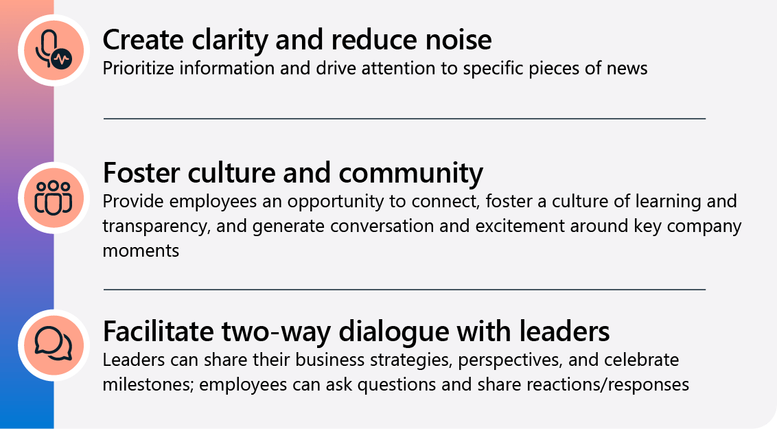 - Find out how we’re transforming communications and employee engagement at Microsoft to start enacting these principles at your organization.