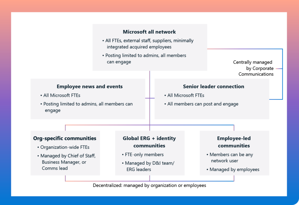 Internally, we share responsibility for these capabilities between Microsoft Digital and our internal business leaders and communicators. Identifying who would lead a community and what level of control they should have was an integral part of establishing our administrative structure for Viva Engage.