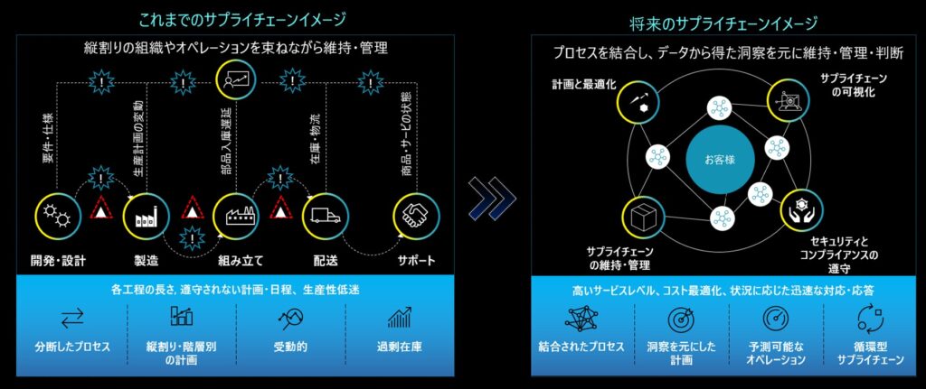 たとえば、これまでは縦割りの組織や独自のオペレーションを束ねながらサプライチェーンの維持・管理が行われてきましたが、その状態ではプロセスが分断され属人化されていることも多く、アクシデントが発生してから受動的な事後対応が多くなってしまいます。