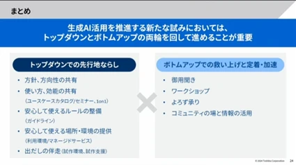 推進プロジェクトは、社員らに初歩的なツールの使い方を教えるところからスタート。ガイドライン、利用・運用環境を整え、活用事例をまとめたユースケースカタログを使って利用イメージを想起してもらうなど、出だしは伴走型で手厚く支援した。幹部に対しては1on1教育を行って理解を促し、AI活用に向けた「地ならし」をトップダウンで進めた。一方、プロジェクトチームが、ワークショップを開催して、現場の業務課題を吸い上げ、解決のための生成AIアプリケーションの試作に関わるなど、現場の声を聞くボトムアップ型施策で生成AI活用の定着を促進した。殿塚氏は「トップダウンとボトムアップの両輪を回すことが大事」と語った。