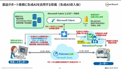 機械メーカーの製品サポート業務の事例では、Fabricで社内のデータを統合し、RAG機能を組み合わせて、サポートに必要な情報を迅速に引き出せるようにした。さらに、顧客の機械をリモートでメンテナンスできる「FalconLink」など、東京エレクトロンデバイスのソリューションも加えて「問題解決の時間を短縮、業務生産性と顧客満足度向上を図ることができる」と訴えた。
