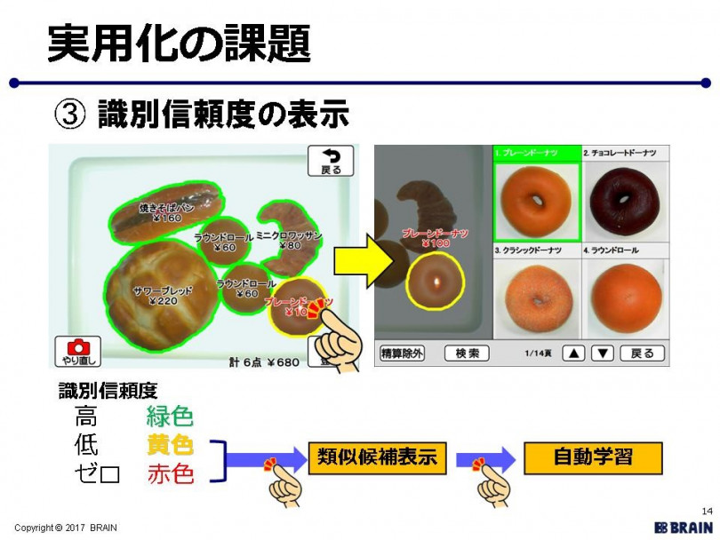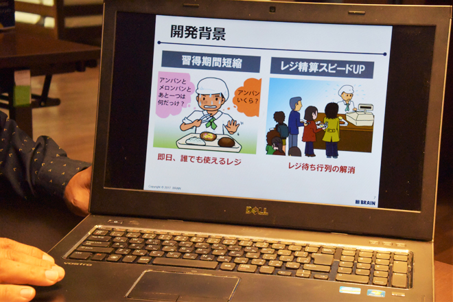 「開発のきっかけは、ある外食業者からベーカリー事業を海外で展開する計画があり、相談されたことです。国内の実験店舗で分かったことですが、パンの種類が30種類より100種類の方が単位面積当たりの売上げが1.5倍となるのです。しかし、多品種になったためにレジ担当者の負担が増え、バーコードをつけるために包装したところ売上げが1/3となってしまいました。そのため、画像識別でレジ業務が出来ないかと相談を受けました。」(神戸氏)