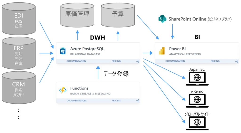 これらの課題を解決するべく、海外拠点を含む社内外の複数のシステムに散在するデータをDWHに統合すること、BIツールを統合することを新しいプラットフォームの要件としました。