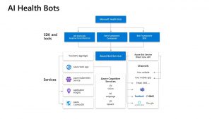 botサービスは100%Azure(マイクロソフトのパブリッククラウドサービス)上で構築されており、従来から提供されているAzure PaaSで抽象化されたデータベース(CosmosDB)や処理エンジン(AKS)を活用し、開発期間の大幅短縮に貢献しました。また拡張も運用しながら可能です。下記の図に記載されていますが提供するユーザインタフェースとして非マイクロソフトのサービス(Facebook、Slack, Amazon Alexaなど)を利用する事も可能です。