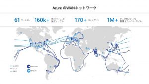 具体的な対応策についてご説明する前にまずAzureのグローバルネットワークについて簡単に触れたいと思います。Azureは全世界で現在61のリージョンを運用しています、Azureのリージョンとは特定地域で集合体として運用されるデータセンター群を指します。日本国内では関東地域に関西地域に2つリージョン(JAPAN EAST, JAPAN WEST)が運用中です。Azureのデータセンター間ネットワークはマイクロソフトが所有している光ファイバーとリース契約しているダークファイバーで構成された閉域網で運用されています。この物理接続は全世界で合計16万マイル以上の光ファイバーと海底ケーブルからなっています。グローバルネットワークには約170ヵ所のエッジサイトという接続ポイントがあり、ここを経由して様々なサービスプロバイダー様やユーザ様の専用線接続がAzureに対して行われています。余談ですが、各データセンター内で設置される光ファイバーは平均100万マイル以上です。