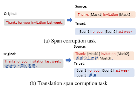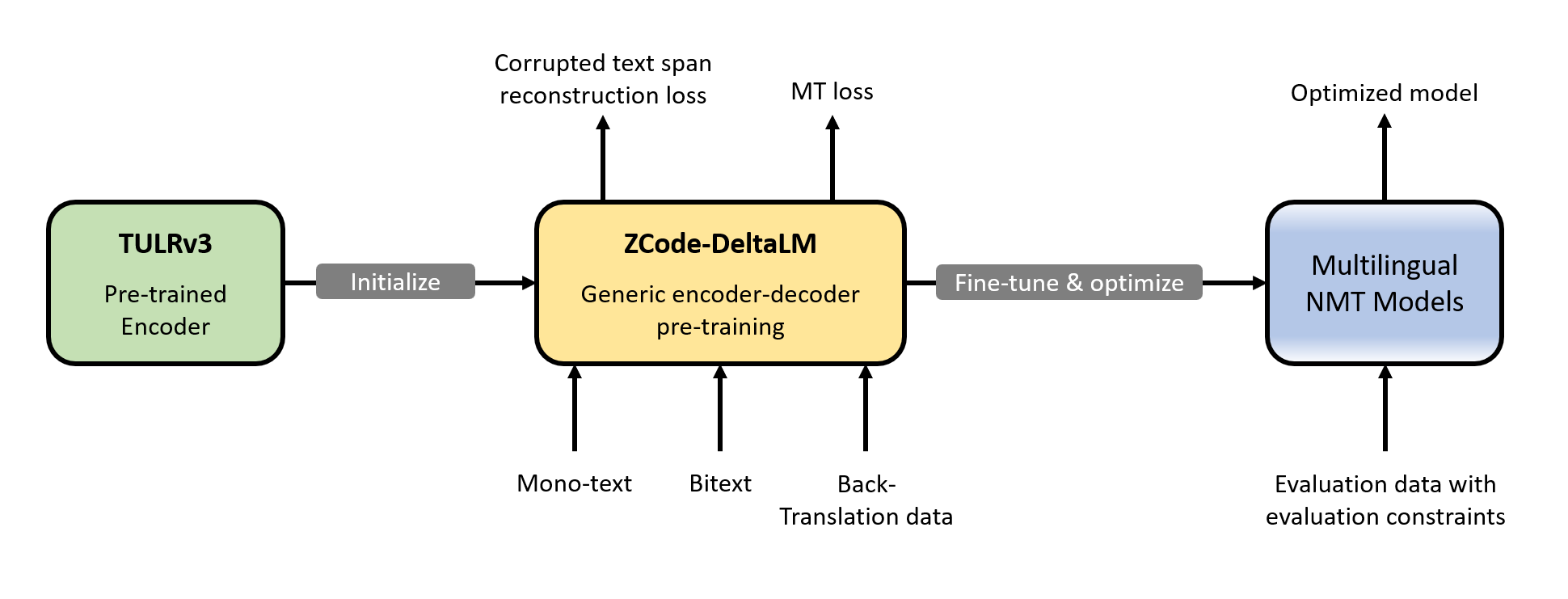 DeltaLM дополнен мощным многозадачностью ZCode: Многозадачное обучение для многоязычного нейронного машинного перевода. Наши модели показывают, что сочетание многозадачного и многоязычного обучения может значительно улучшить обучение крупномасштабным предварительно обученным языковым моделям. Такая многозадачная парадигма многоязычного обучения использует индуктивную предвзятость и регуляризацию от нескольких задач и языков одновременно для лучшей работы с различными последующими задачами. Мы используем задачу перевода, задачу автоматического кодирования и задачу повреждения диапазона перевода, как показано на рисунке ниже.