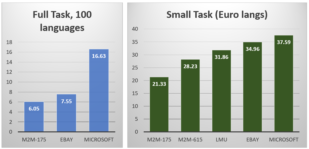 Сложив все это вместе, мы знали, что у нас есть удивительная многоязычная система, но официальные результаты на слепом тестовом наборе превзошли наши ожидания. Мы набрали 2,5-9 BLEU впереди следующего конкурента и 10-21 BLEU-очковые баллы, опередив базовую модель M2M-175. В тесте разработчиков мы сравнили с более крупной моделью M2M-615, которую мы также обошел на 10-18 пунктов.