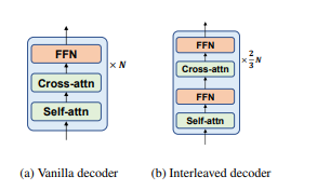 DeltaLM является моделью кодировщика-декодера, но вместо обучения с нуля она инициализируется из ранее предварительно обученной современной модели кодировщика, в частности ,ТУЛРв3). В то время как инициализация кодировщика проста, декодер менее прост, поскольку он добавляет перекрестное внимание к самовнимания кодировщика. DeltaLM решает эту проблему с помощью новой взаимосвязанной архитектуры, где самовнимания и перекрестное внимание чередуются между слоями, причем самовнимания используется в нечетных слоях, и перекрестное внимание, используемое в четных слоях. При таком чередовании структура декодера соответствует кодировщику, и поэтому она также может быть инициализирована таким же образом из TULRv3.